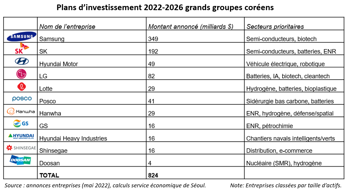 Onze « chaebols », parmi lesquels Samsung, SK, Hyundai et LG, ont annoncé une hausse de leurs investissements dans plusieurs chaînes de valeur critiques, comme les semi-conducteurs, la mobilité électrique et la transition bas carbone.