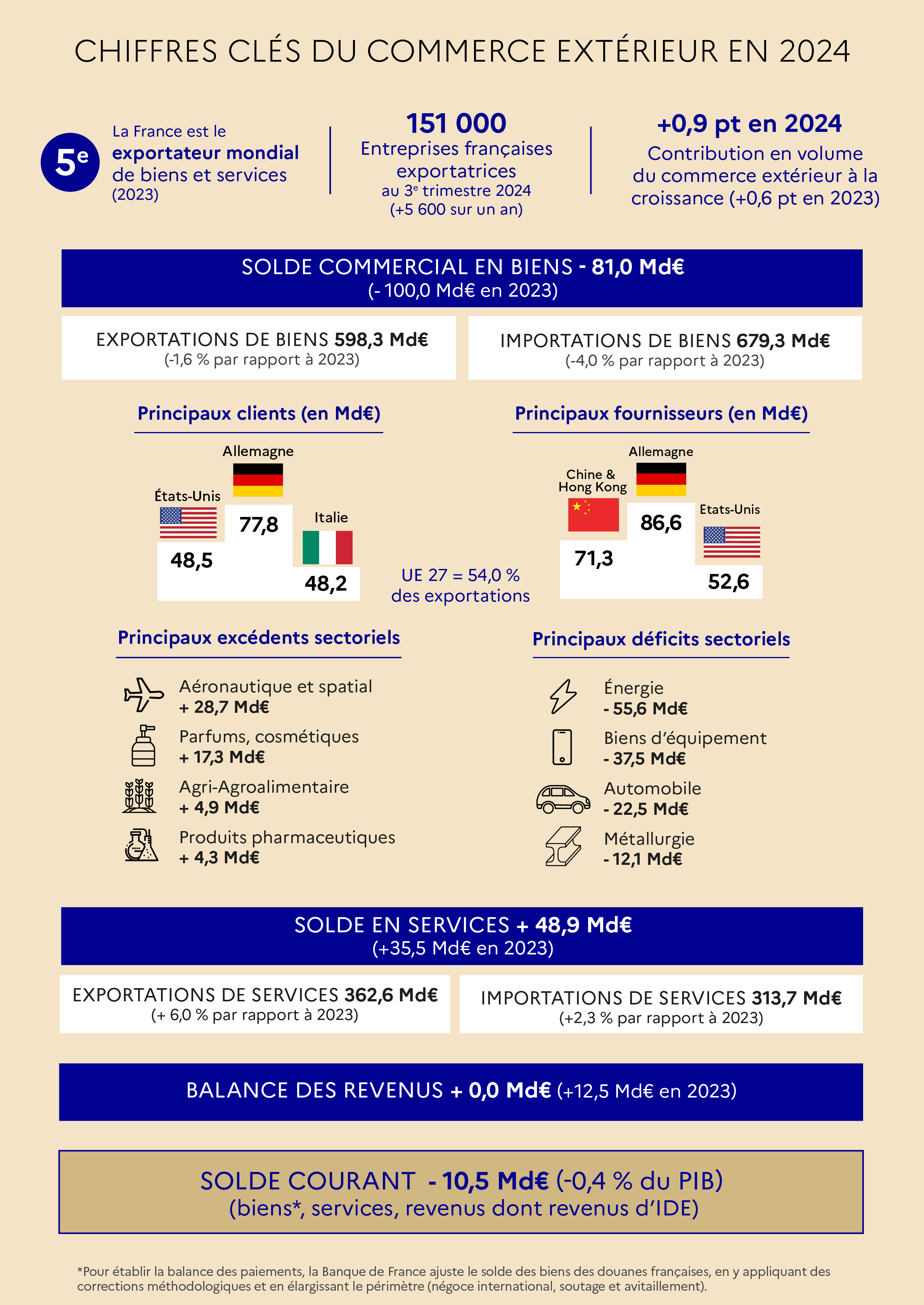En 2024, la balance commerciale française s'améliore de nouveau avec un déficit qui se résorbe à ‑81,0 Md€, après ‑100,0 Md€ en 2023 et ‑162,6 Md€ en 2022, sans retrouver son niveau pré-Covid (-58 Md€ en 2019). Cette amélioration s’inscrit dans un contexte de recul des échanges lié à une baisse des prix. Les exportations diminuent de 1,6 % en valeur, à 598,3 Md€, mais retrouvent leur niveau pré-crise en volume. Les importations reculent de 4,0 % à 679,3 milliards d'euros.