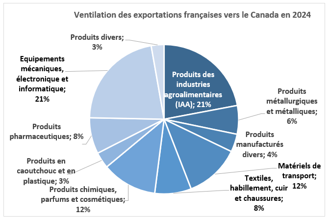 Entre 2017 et 2024, tous les secteurs à l’exception du secteur du bois, du papier et du carton, ont enregistré une hausse des exportations vers le Canada. Principale bénéficiaire des baisses de droits de douane, l’industrie agroalimentaire, qui représente 21% des exportations totales françaises, a vu ses exportations augmenter de 35% par rapport à 2017 (+4% en 2024 par rapport à 2023) pour atteindre 899 M€, portées par les vins, champagnes et spiritueux (+27% depuis 2017) pour un montant de 556 M € en 2024. Les vins et spiritueux représentent 13% de l’ensemble des exportations françaises à destination du Canada et 62% des exportations de produits agroalimentaires français. Les exportations de fromages, qui étaient auparavant frappées par des droits de douane allant jusqu’à 227 %, ont progressé de 71% entre 2017 et 2024, tirant parti des quotas octroyés par le Canada (contingent maximum de 17 700 tonnes dont 16 000 de fromages affinés et 1 700 t de fromages industriels). Bénéficiant également de l’accord, les exportations de textiles et chaussures ont plus que doublé entre 2017 et 2024, passant de 158 M€ à 323 M€ (7,7% du total des exportations en 2024) tandis que les exportations de produits chimiques, parfums et cosmétiques ont progressé de 54% sur la période pour atteindre 488 M € en 2024 (11,6% des exportations françaises vers le Canada). A ce jour, seul le secteur du bois, papier et carton a vu ses exportations vers le Canada diminuer depuis 2017 avec une baisse de -25% passant de 61 M€ en 2017 à 46 M€ en 2024.