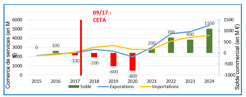 Evolution du commerce de services entre la France et le Canada entre 2015 et 2024 :