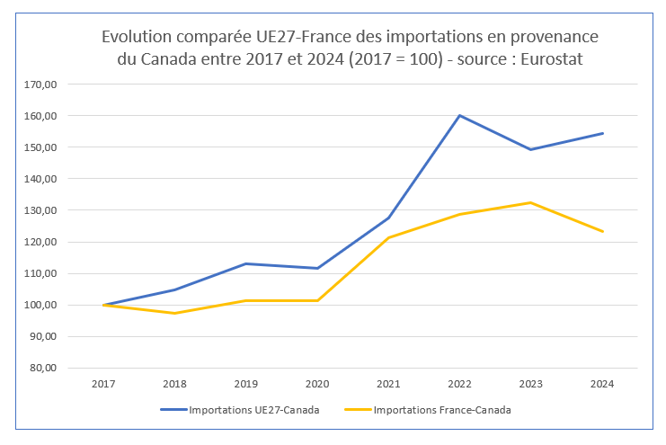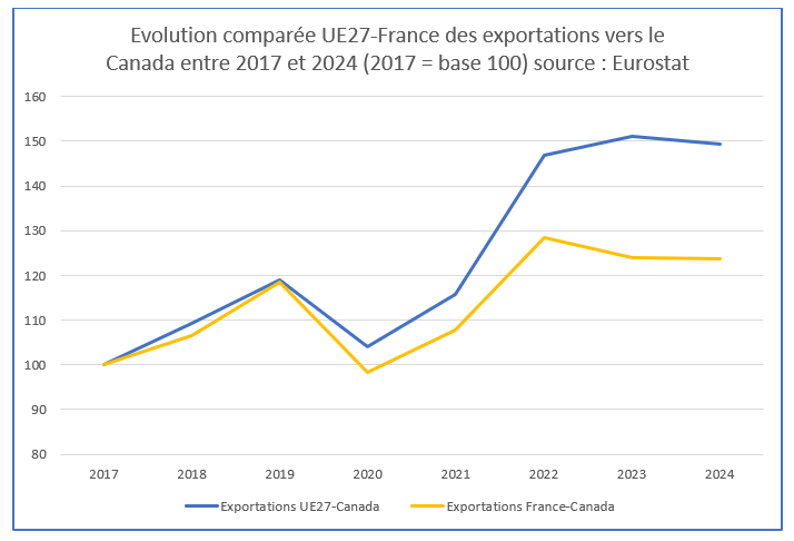 Depuis l’entrée en vigueur provisoire du CETA, le 21 septembre 2017, le commerce France-Canada a augmenté de près de 30%. Alors que la Commission européenne estimait avant l’entrée en vigueur que le CETA devrait, à terme, augmenter de 25% les échanges commerciaux de biens UE-Canada, ceux-ci ont augmenté de 51% entre 2017 et 2024 : les exportations européennes de biens ont crû de 49 %, passant de 32 Md€ à 48 Md€, les importations de 54% (de 18 Md€ à 28 Md€), conduisant à un excédent européen en augmentation de 43% sur la période (de 14 à 20 Md€). Le commerce France-Canada s’inscrit dans cette dynamique, quoique de manière moins prononcée qu’au niveau européen : entre 2017 et 2024, le commerce de biens entre la France et le Canada a augmenté de 1,8 Md€, passant de 6,3 Md€ à 8,1 Md€, soit une croissance de +29 %, légèrement supérieure à celle du commerce extérieur français sur la même période (+27 %). Cette hausse est favorable à la France, les exportations françaises de biens ayant augmenté de 1 Md €, passant de 3,2 Md € à 4,2 Md € (+33%, contre 26% pour les exportations françaises dans leur ensemble) tandis que les importations françaises en provenance du Canada ont augmenté de 800 M €, passant de 3,1 Md € à 3,9 Md € (+ 26%, contre + 27% pour les importations françaises dans leur ensemble). En 2024, la balance commerciale française pour les biens affiche un excédent de 274 M €. Depuis la mise en œuvre du CETA, le solde commercial français pour les biens a toujours été excédentaire à l’exception des années 2021 (déficit de 295 M € pour la France) et 2023 (léger déficit de 22 M €). En matière de services, les échanges entre la France et le Canada ont atteint un sommet jamais atteint en 2024, avec 9,7 Md € de services échangés entre les deux pays, permettant à la France de dégager un excédent de 1,1 Md € (près du double de l’excédent de 2023). Les exportations françaises de services ont atteint un record à 5,4 Md € en 2024, en hausse de 15% par rapport à l’année précédente (4,7 Md € en 2023). Depuis 2017, les exportations françaises de services à destination du Canada ont augmenté de 116%.