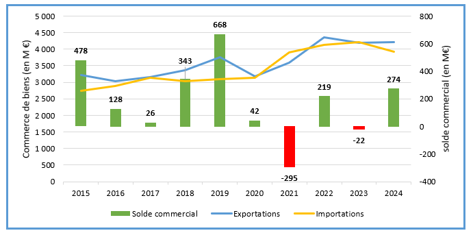 Evolution du commerce de biens entre la France et le Canada entre 2015 et 2024 :