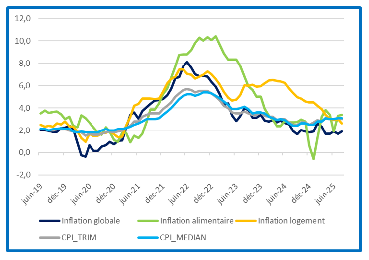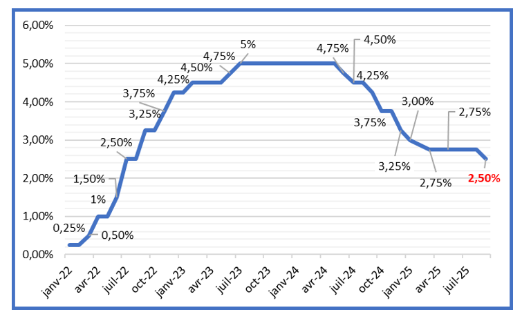 La Banque du Canada, après avoir entamé un cycle d’assouplissement monétaire en juin 2024, a marqué une pause au printemps 2025 face à l’incertitude commerciale, le temps d’observer les effets réels sur l’économie canadienne. L’inflation, revenue à 1,9 % en août 2025 (+ 0,2 point par rapport à juillet mais bien en dessous du sommet de 8,1 % en juin 2022), reste contenue (Annexe II), malgré des tensions persistantes sur les prix alimentaires (3,5 %) et le coût du logement (2,6 %). L’affaiblissement du marché de l’emploi et le recul de l’activité au T2 2025 ont conduit la Banque du Canada à procéder à une nouvelle baisse de son taux directeur de 25 points de base le 17 septembre 2025, le fixant à 2,5%, malgré quelques pressions persistantes sur l’inflation (Annexe III).