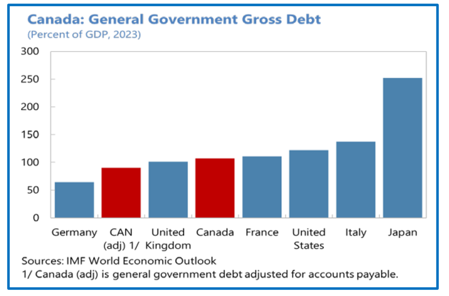 Le Canada peut s’appuyer sur des finances publiques comparativement meilleures que dans le reste de l’OCDE, malgré quelques points de vigilance. Au Canada, la dette brute des administrations publiques atteint 107% du PIB fin 2023 d’après le FMI, soit un niveau relativement bas en comparaison aux autres pays, notamment les pays du G7 (Annexe IV). Cependant, dans le dernier document budgétaire présenté, l’Enoncé économique d’automne fin 2024, le déficit public n’a pas pu être ramené à moins de 1% du PIB. Le déficit était évalué à 61,9 Mds CAD en 2023-2024, soit au-delà de l’objectif initial de 40 Mds CAD, en raison de dépenses ponctuelles (16,4 Mds CAD pour l’indemnisation autochtone, 4,7 Mds CAD d’allocations Covid, etc.) et de mesures temporaires (suspension de la TPS/TVH pendant 2 mois pour un coût estimé de 1,6 Md CAD).