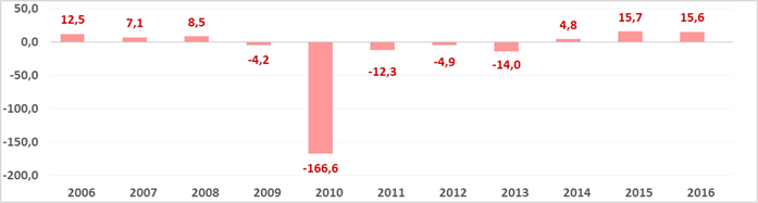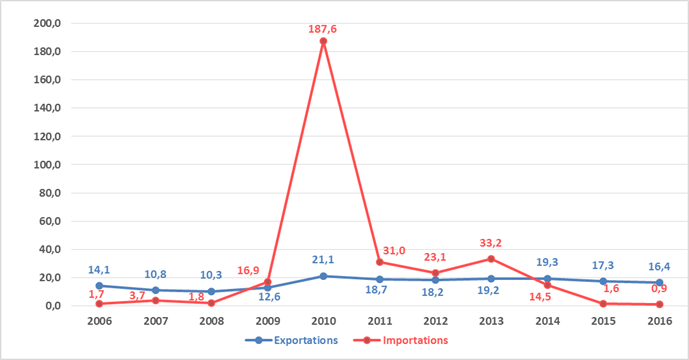 Graphique 2 : Evolution de la balance commerciale entre 2007 et 2017 (en M €)